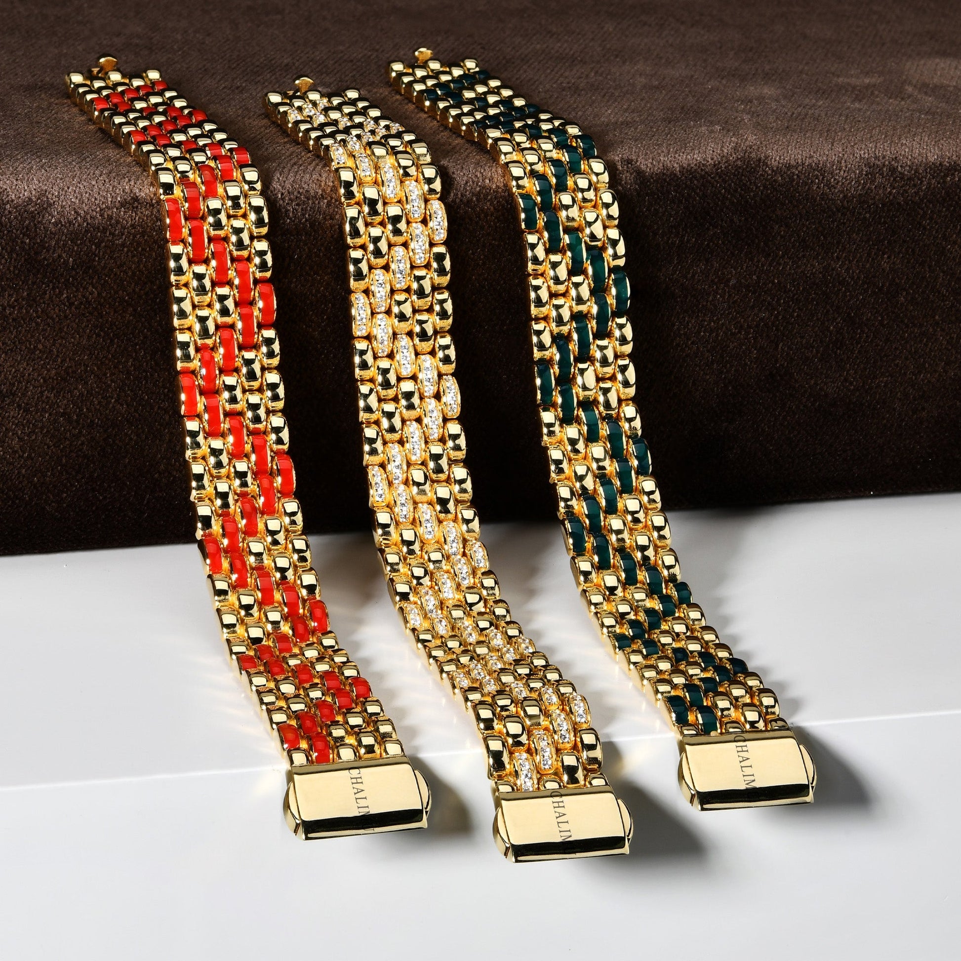 Faites une déclaration avec ce bracelet CHALIMU 14MM en or 14 carats avec émail rouge ! Fabriqué en or brillant et décoré d'émail rouge luxueux, ce bracelet remarquable fera tourner les têtes et deviendra un sujet de conversation instantané. Rayonnez de sophistication et d’élégance partout où vous allez !