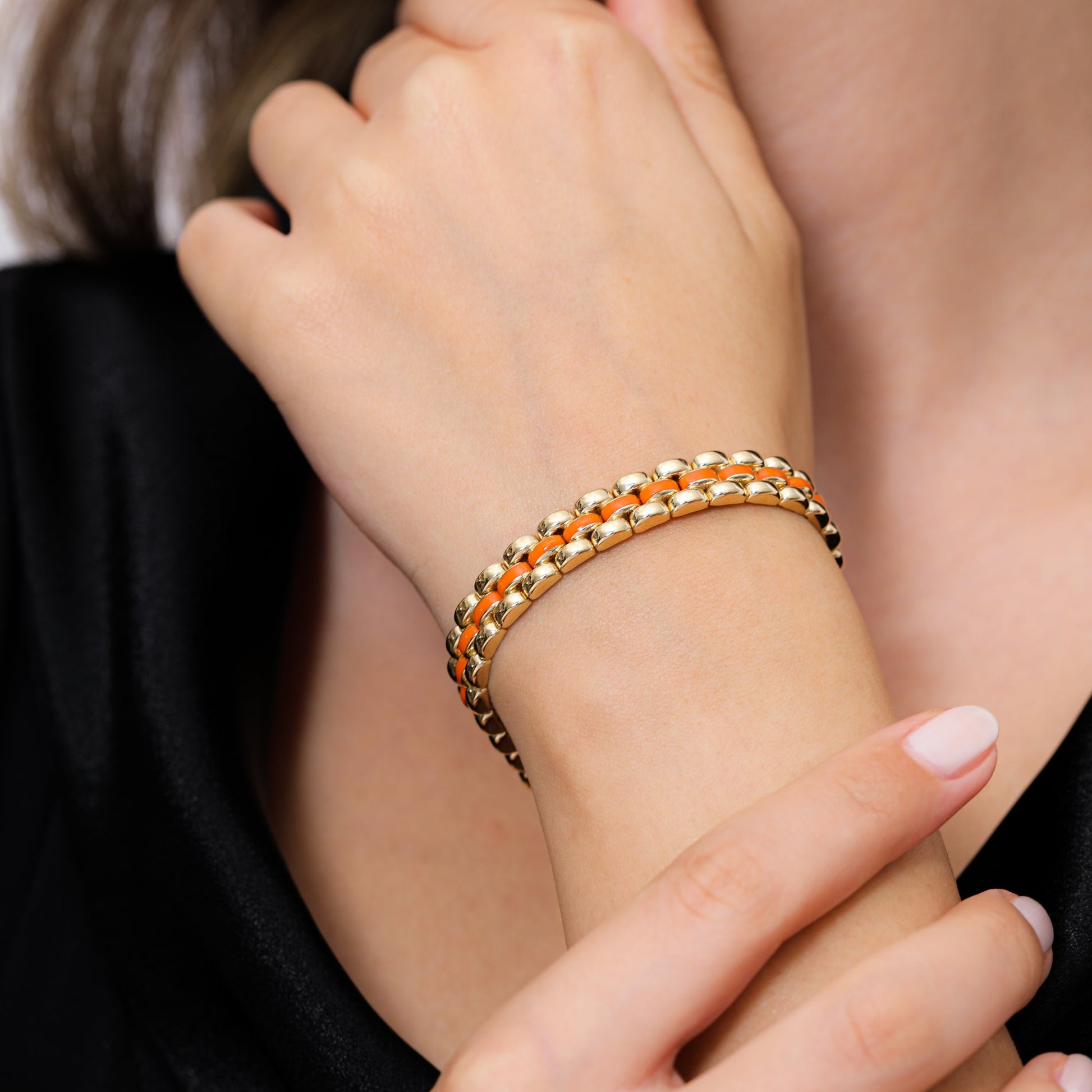 Introducing our exquisite Lorenzo 9MM 14K Gold Bracelet from our exclusive collection. Made with 14K gold and adorned with a vibrant orange enamel, this 9mm bracelet is a true statement piece. Elevate your style and make a bold statement with this luxurious and tasteful accessory.