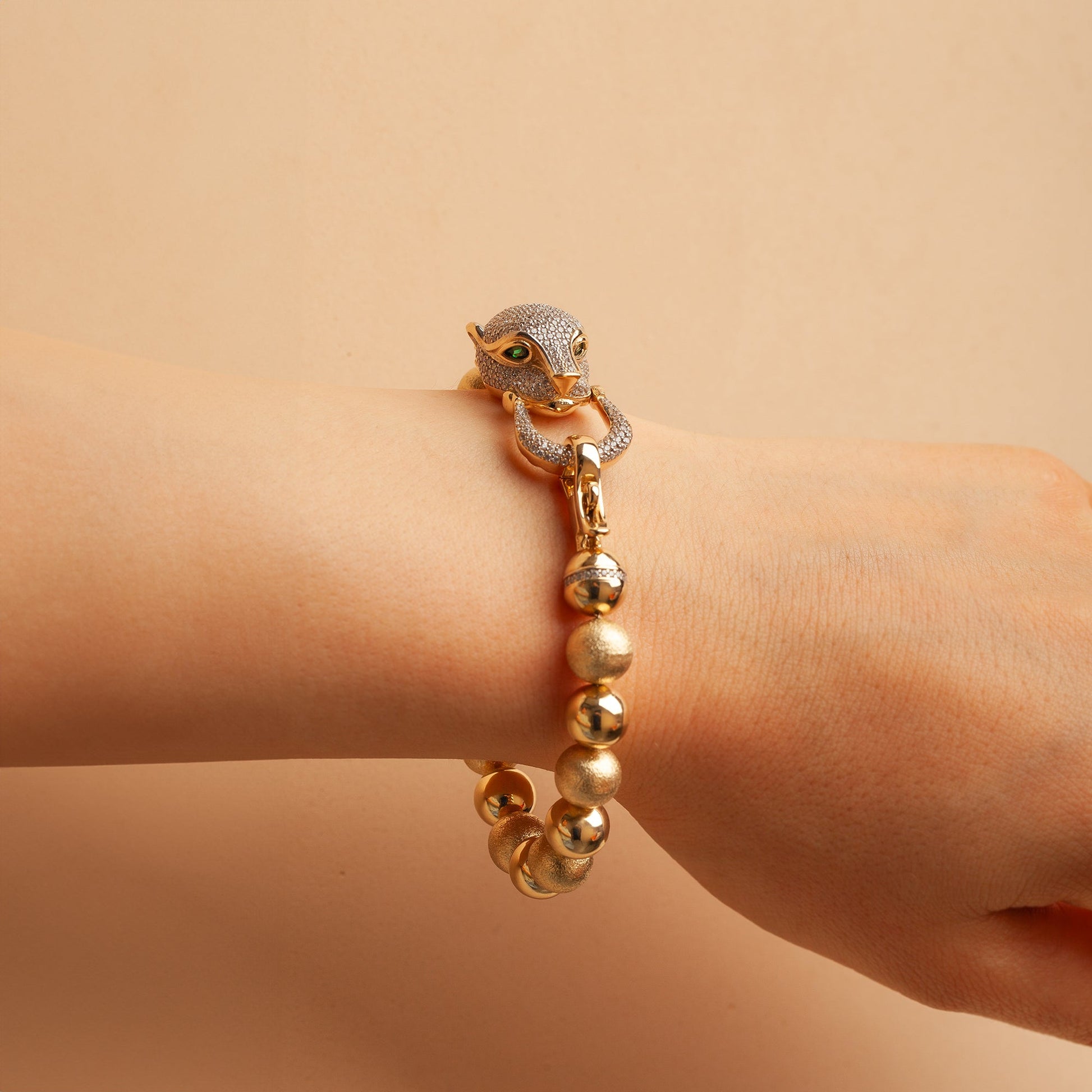 Panter Top Desenli 14 Ayar Altın Bilezik, zarafetin ve şıklığın mükemmel birleşimini sunuyor. Özel panter deseniyle tasarlanmış bu bilezik, 14 ayar altının ışıltısıyla parlıyor ve her anınıza sofistike bir dokunuş katıyor. İnce işçilikle hazırlanmış bu zarif bilezik, hem günlük kullanımda hem de özel günlerde stilinizi tamamlayacak ideal bir aksesuardır. Kendinizi veya sevdiklerinizi bu eşsiz tasarım ile şımartın.